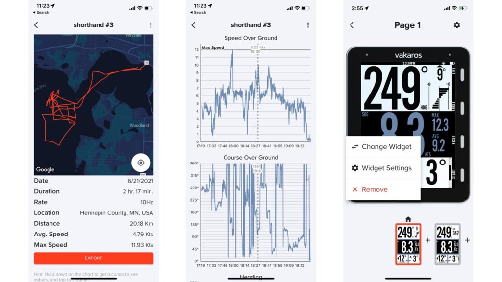 VAKAROSアプリを使えば、航跡ログをワンタッチで即座にスマートフォンやタブレットにダウンロード。その場で航跡データを確認出来ます。更にスピードやヘディング、ヒールなどもグラフで見られます。